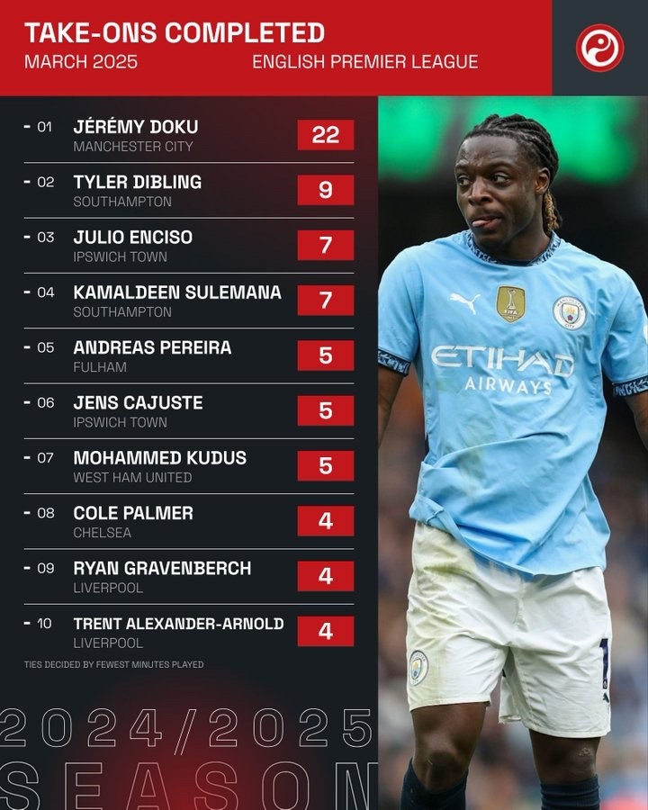 英超过人王!多库在三月的英超比赛中成功完成22次过人位列第一