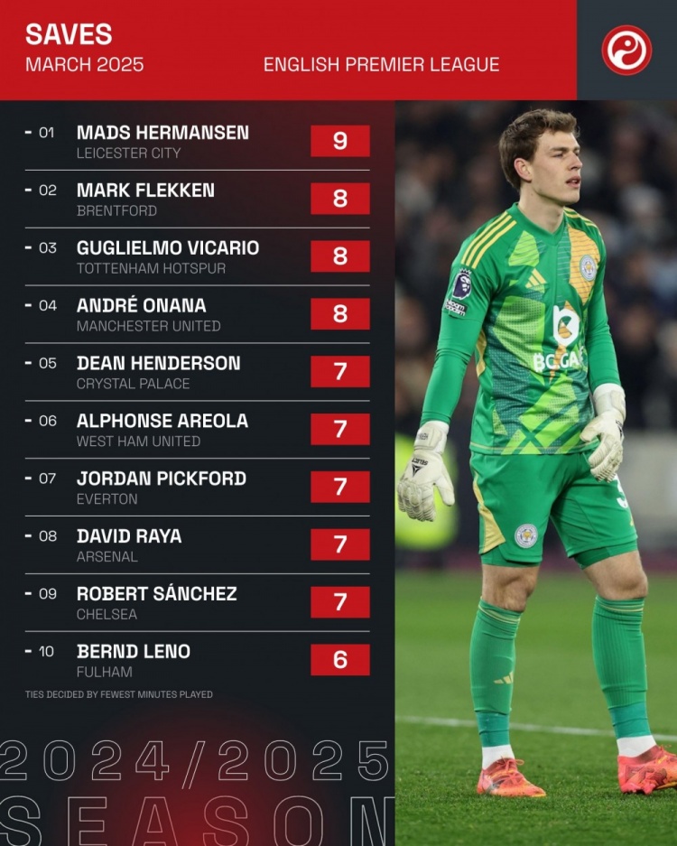 - 英超3月扑救次数排名:赫尔曼森9次居首,奥纳纳8次&拉亚7次