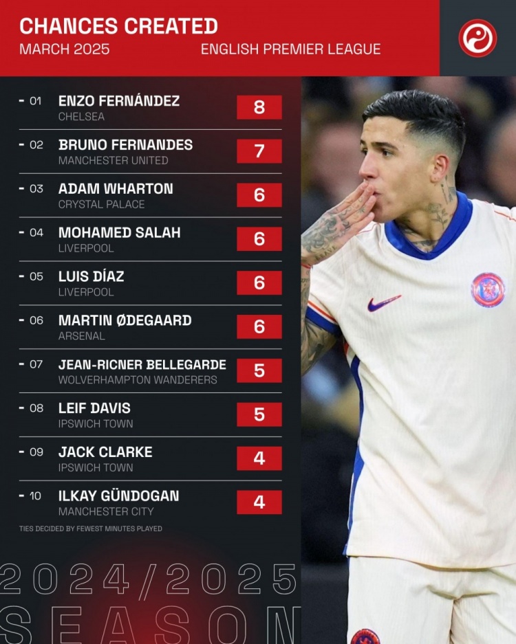 4月1日讯 Squawka统计了3月份球员在英超创造机会的次数,并列出榜单,恩佐8次居首,B费7次第二。
