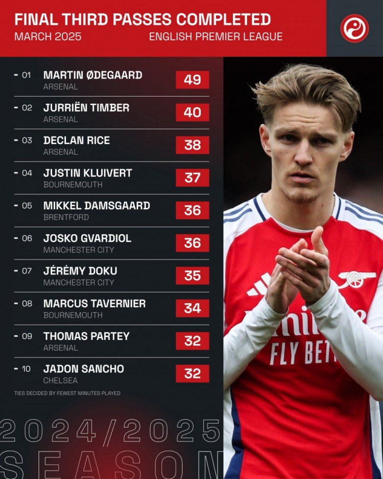 英超3月进攻三区成功传球排名:厄德高49次居首,阿森纳包揽前三