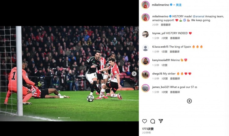 他也在赛后通过社媒晒出自己的进球瞬间,并配文:“7造历史!@阿森纳,难以置信的球队,难以置信的支持!❤️⛳️⚽️我们继续努力!”