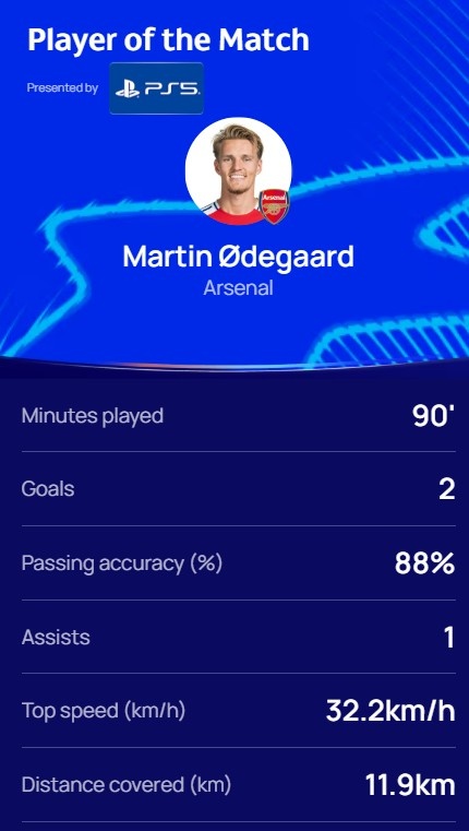 本场比赛厄德高发挥出色,打进2球并有1次助攻,传球成功率88%,跑动距离达到11.9km,赛后他也当选欧冠官方本场最佳球员。