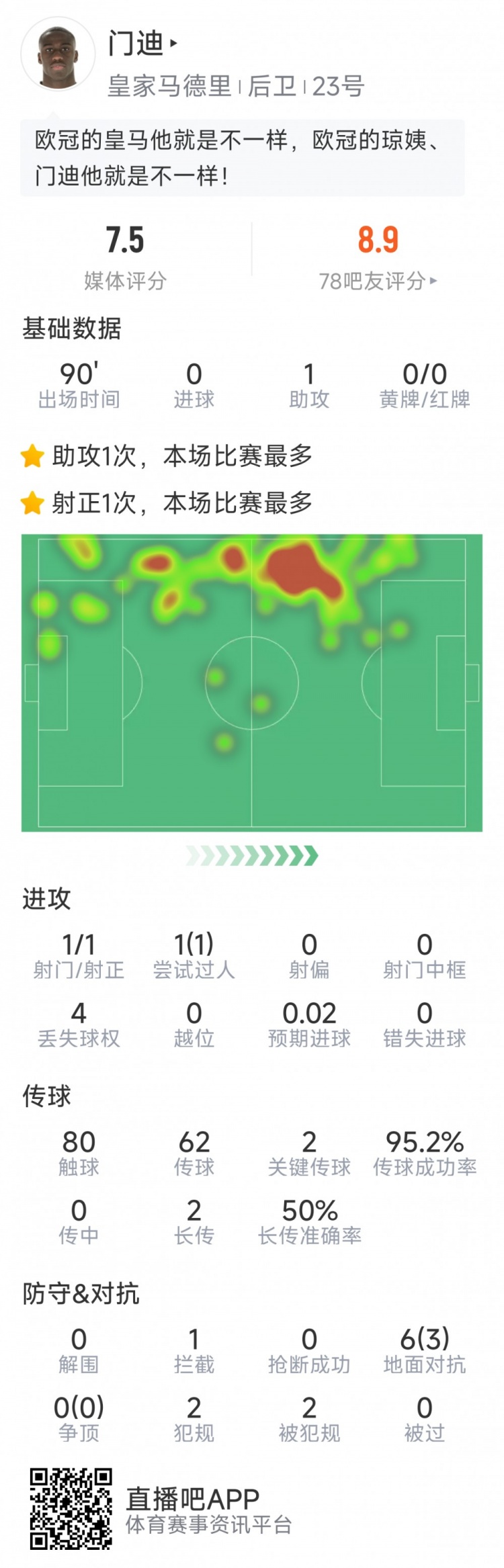 3月5日讯 在本轮欧冠皇马2-1击败马竞的比赛中,门迪送出一次助攻,以下为他在本场数据: