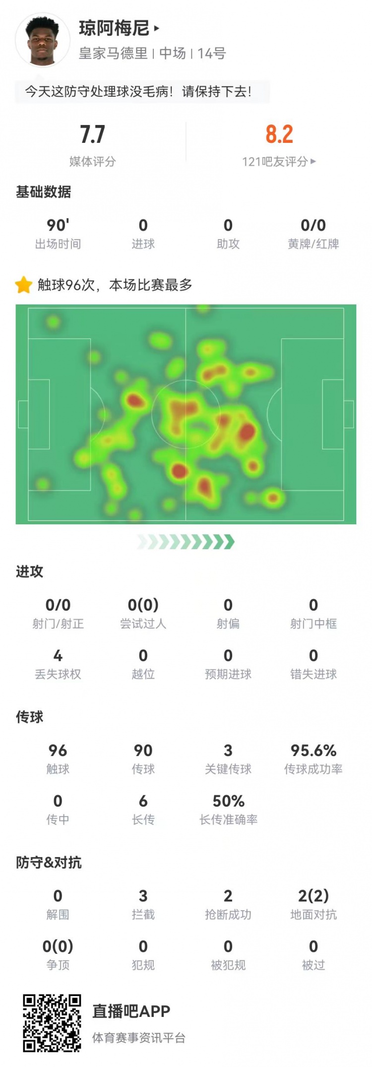 - 琼阿梅尼本场数据:3关键传球+3拦截2抢断0被过 获评7.7分