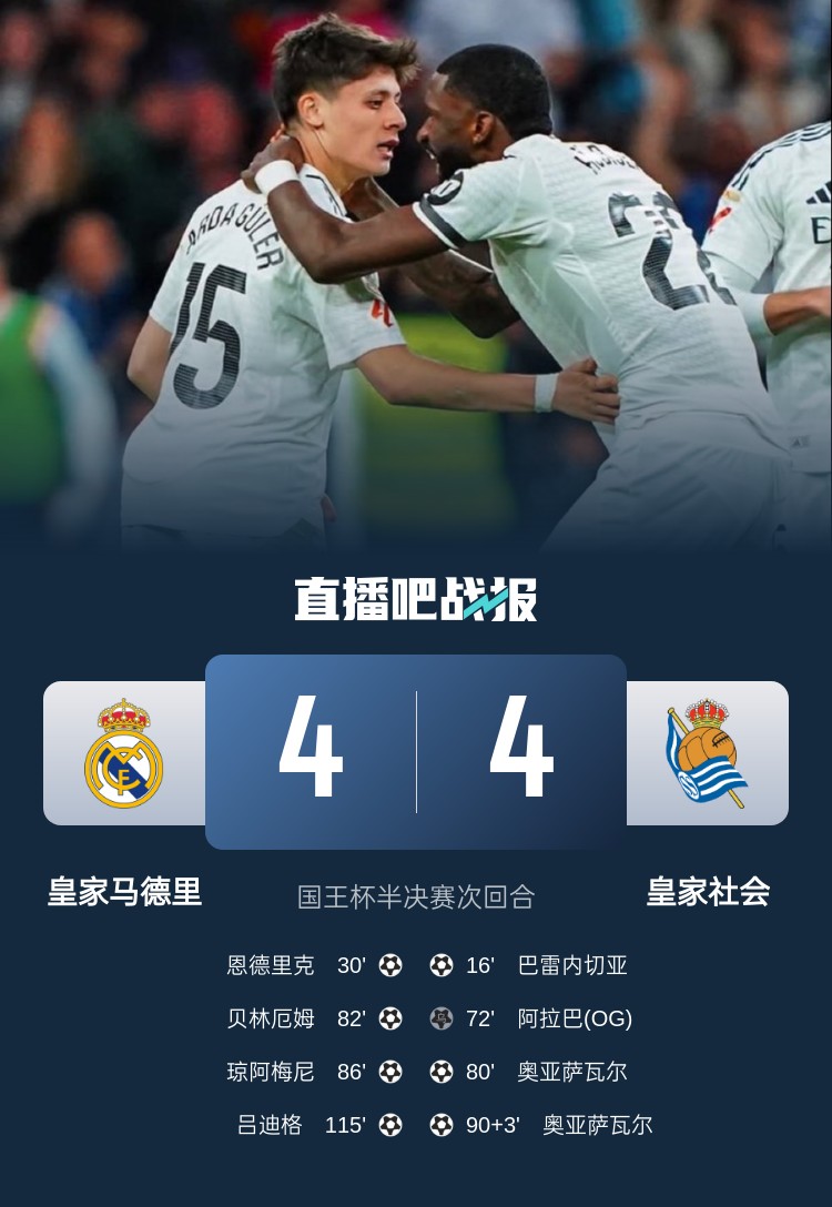 晋级决赛!皇马4-4总分5-4皇社 吕迪格加时绝杀恩德里克贝林建功