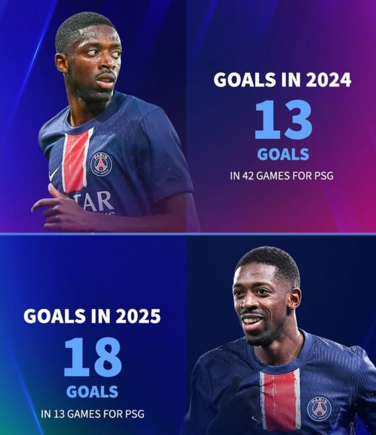 数据统计显示,登贝莱去年为巴黎各项赛事42场仅打进13球,而今年13场已打进18球。