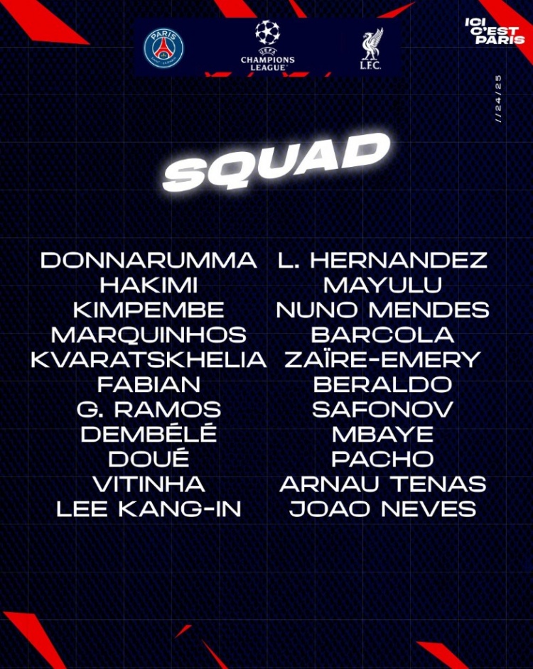 巴黎对阵利物浦大名单:登贝莱领衔锋线,马尔基尼奥斯坐镇后防