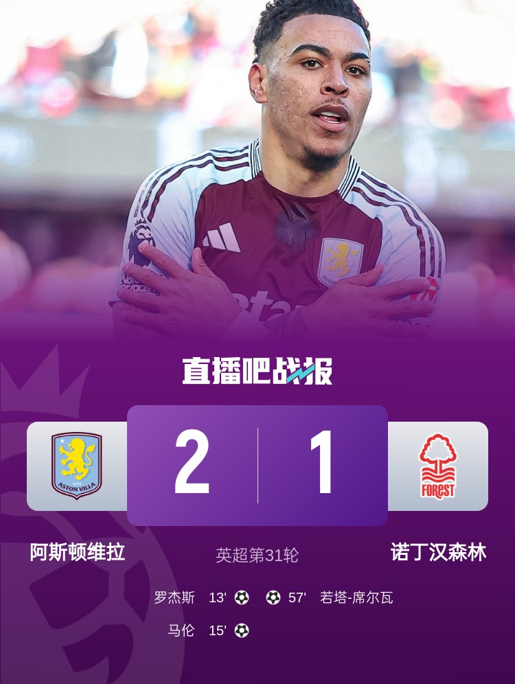英超第31轮,维拉2-1森林,终结对手英超3连胜。上半场,罗杰斯和马伦2分钟内帮助维拉2球领先;下半场,若塔-席尔瓦扳回一球。