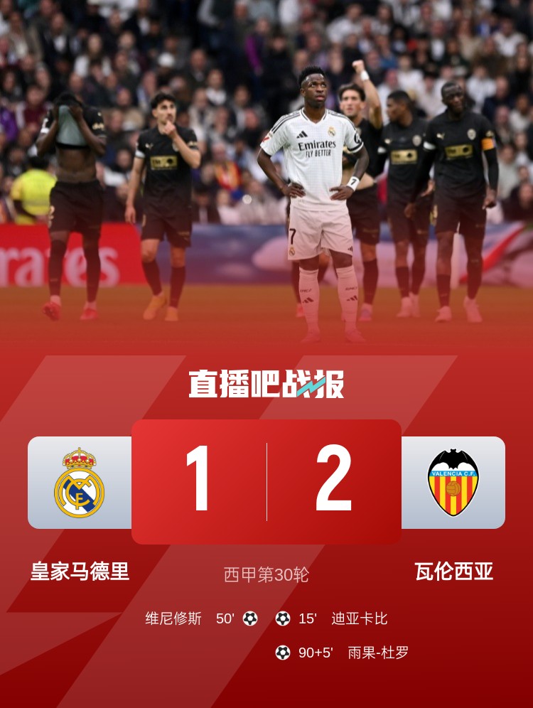 遭绝杀!皇马1-2瓦伦 维尼修斯进球+失点杜罗绝杀 皇马落后3分