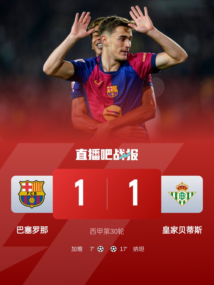 西甲第30轮,巴萨1-1贝蒂斯,联赛九连胜终结。上半场,费兰-托雷斯助攻加维破门,纳坦扳平;下半场,两队均未改写比分。