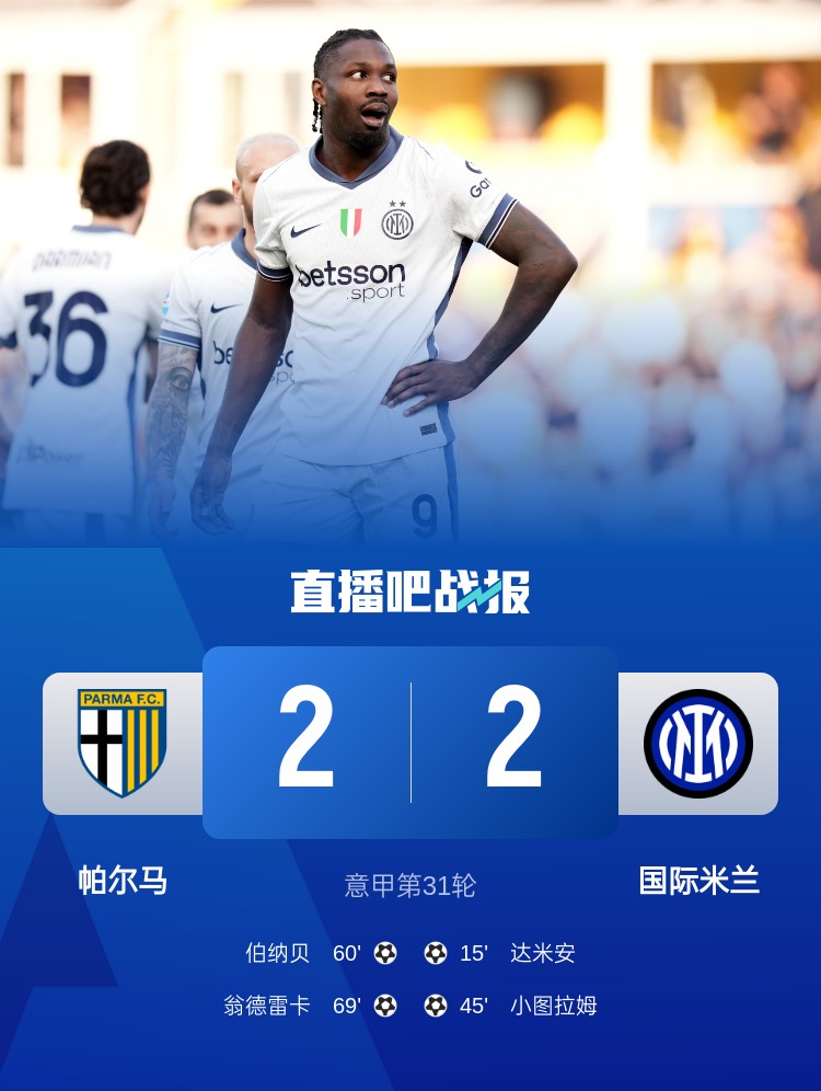 意甲第31轮,国米客场2-2帕尔马。上半场,达米安劲射破门,小图拉姆抢点建功;下半场,伯纳贝远射扳回一城,翁德雷卡抽射变线入网扳平。
