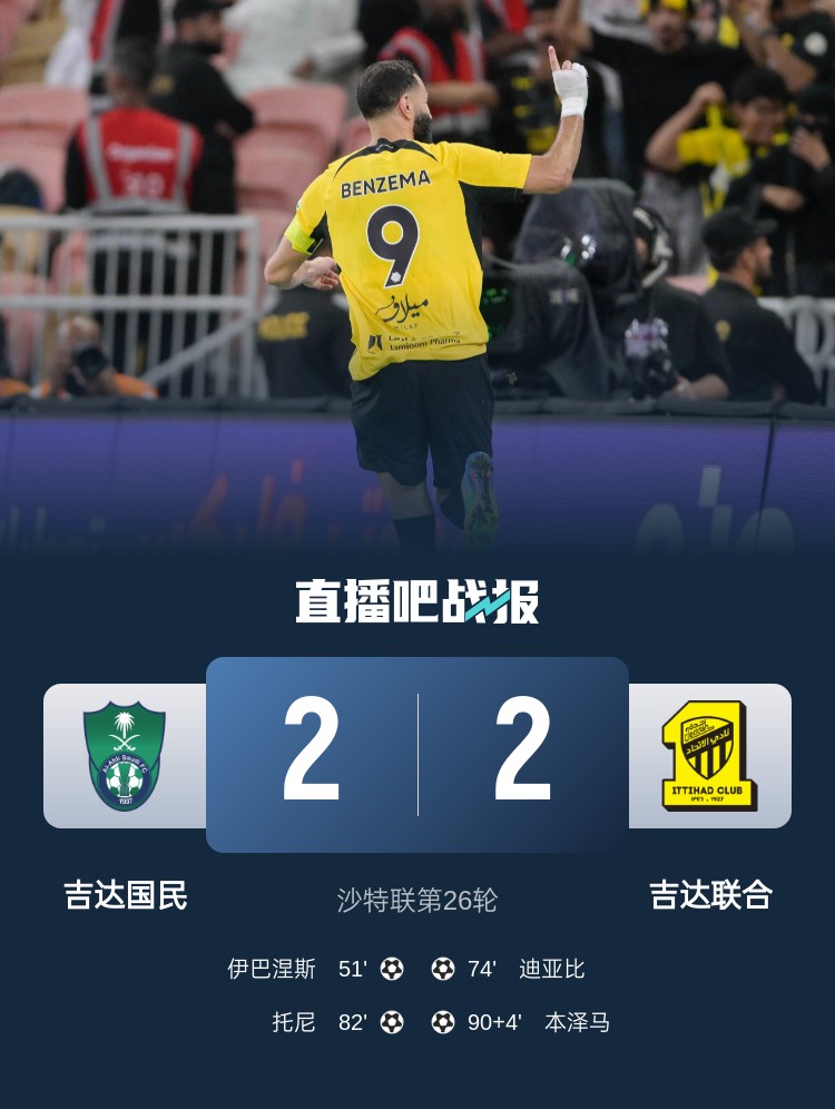 沙特联第26轮,吉达联合2-2吉达国民仍5分领跑。上半场,马赫雷斯远射造险,托尼禁区被萨德放倒裁判没表示,吉达联合0射正;下半场,坎特失空门,伊巴涅斯头球破僵,迪亚比推射破门扳平,坎特乌龙助攻托尼抽射反超,本泽马补时绝平。