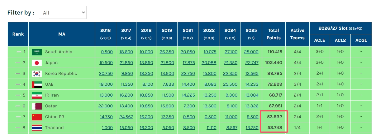这也意味着中国参加26/27赛季的亚足联赛事名额从2+1+1降为1+1+1(一支直通亚冠精英正赛+1个亚冠精英附加赛+1支直通亚冠二级联赛正赛)。
