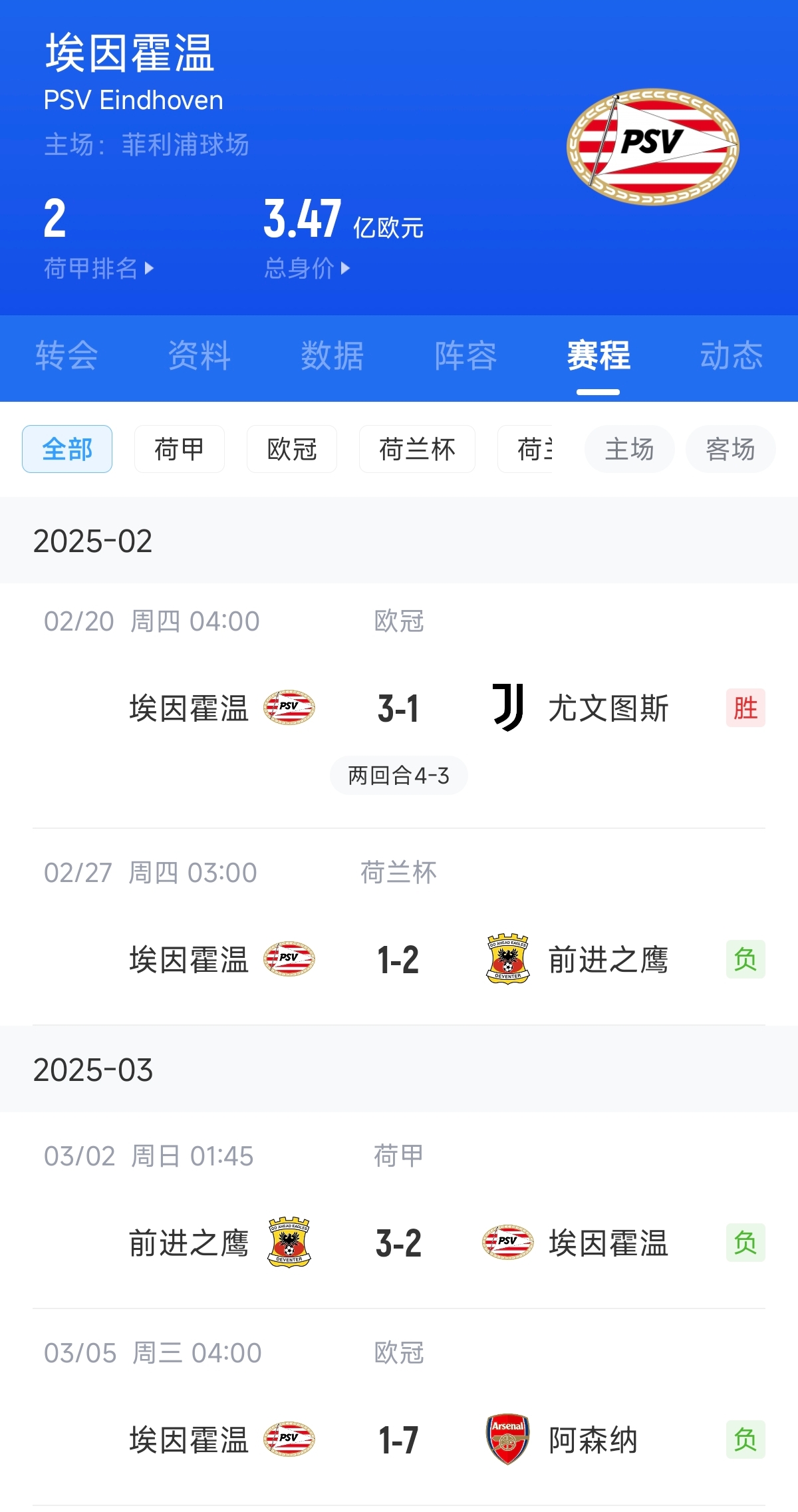 2月27日,埃因霍温荷兰杯半决赛1-2不敌前进之鹰,无缘决赛。3月2日荷甲联赛,埃因霍温2-3被前进之鹰双杀,荷甲再丢3分,距离榜首阿贾克斯已有8分差距。3月5日凌晨,埃因霍温欧冠遭遇惨败1-7不敌阿森纳。