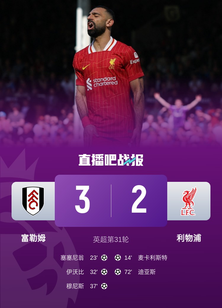 利物浦本轮3-2不敌富勒姆,利物浦后防集体梦游,球队也吃到了英超赛季第二败。