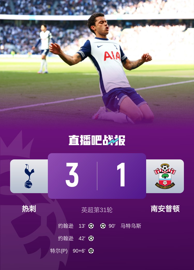 热刺本轮3-1击败南安普顿,圣徒在联赛剩余7轮的情况下提前降级,也创下了联赛纪录。