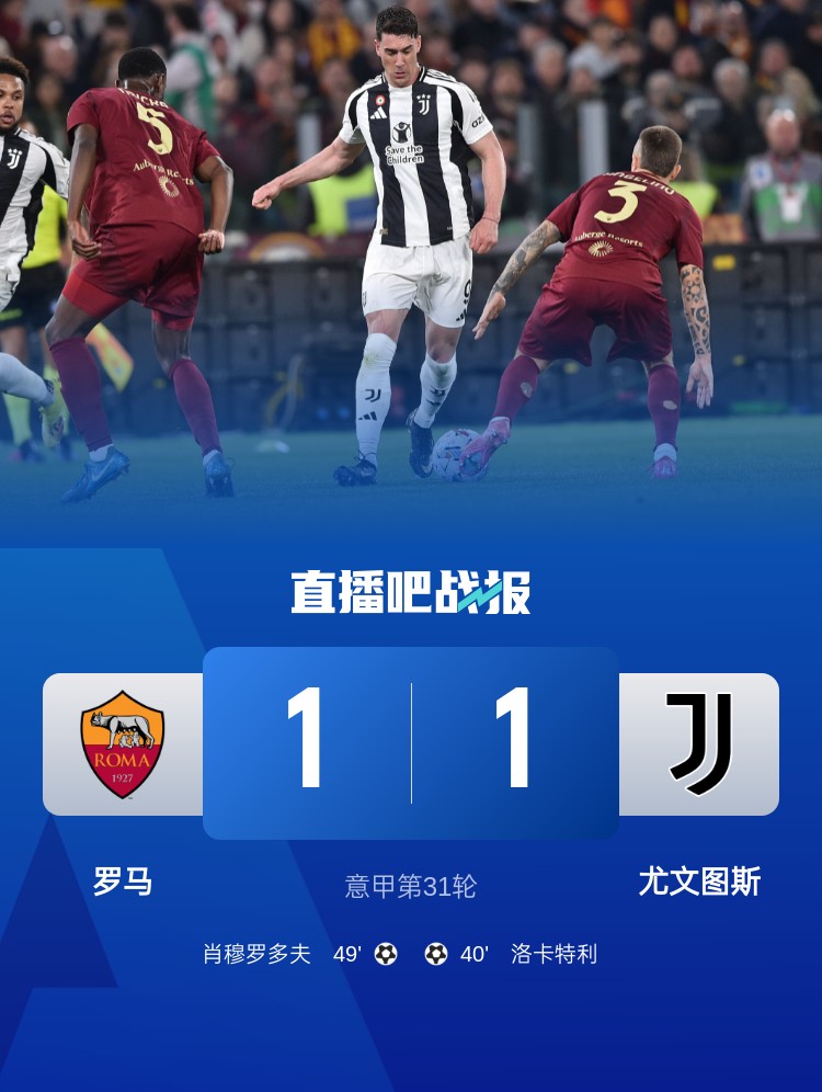 尤文1-1战平罗马,罗马的联赛7连胜遭终结,不过红狼军团的联赛不败场次也来到15场。