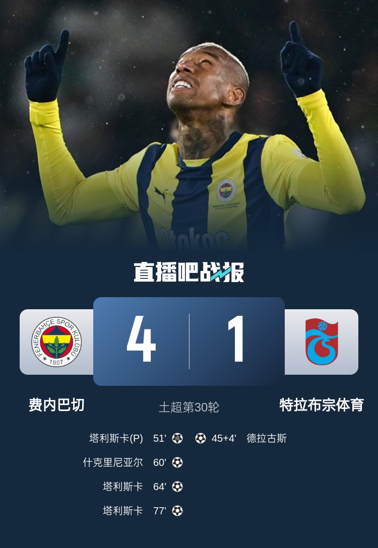 费内巴切本轮4-1击败特拉布宗体育,塔利斯卡戴帽,费内巴切距榜首3分。