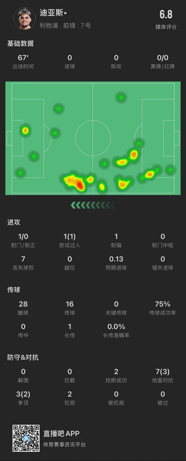 迪亚斯本场:1射门0射正,贡献2抢断,10次对抗成功5次,犯规2次