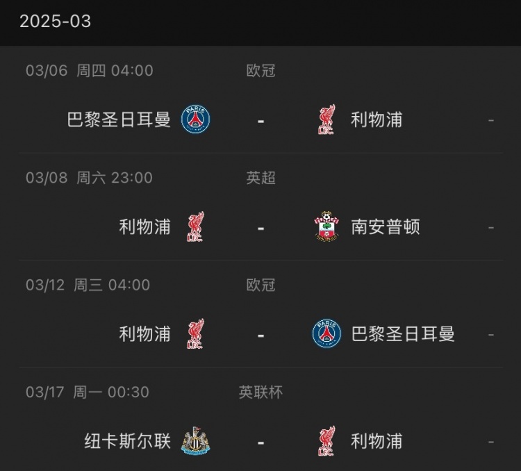 利物浦本月赛程↓