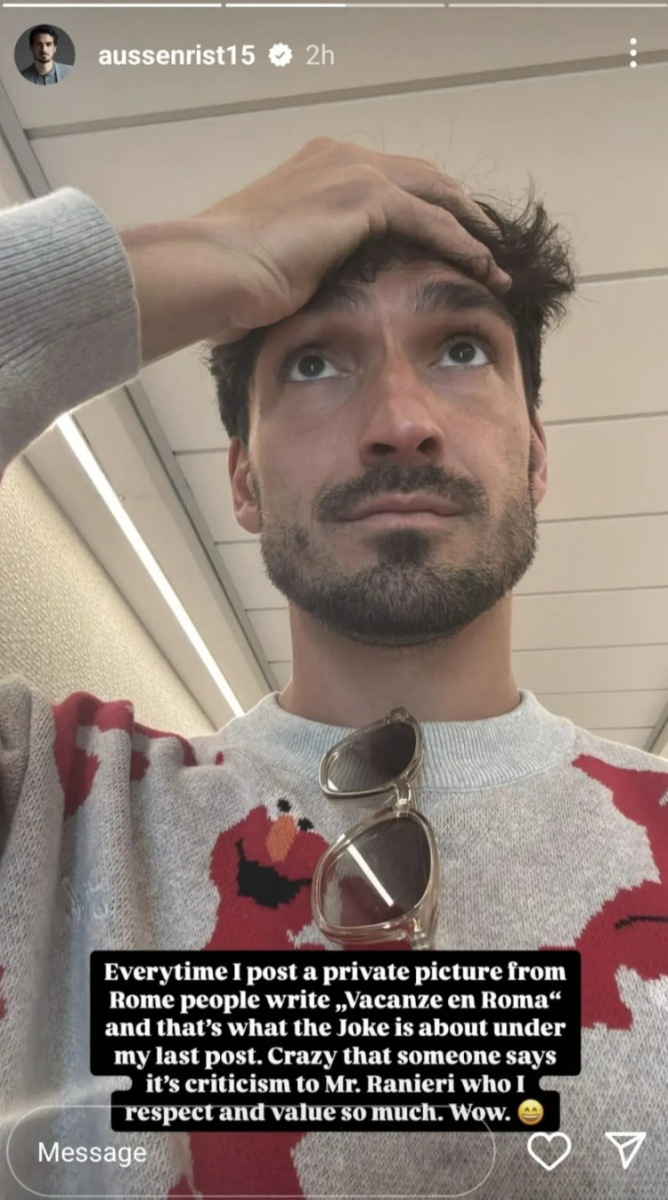 随后,胡梅尔斯更新社媒进行澄清。他晒出自己表情无奈的自拍,并写道:每当我发布在罗马的私人照片时,人们都会写‘罗马假日’,这就是我上一篇帖子下面闹出的笑话。 有人说那是对拉涅利先生的批评,这太疯狂了,我非常敬重他。哇。????