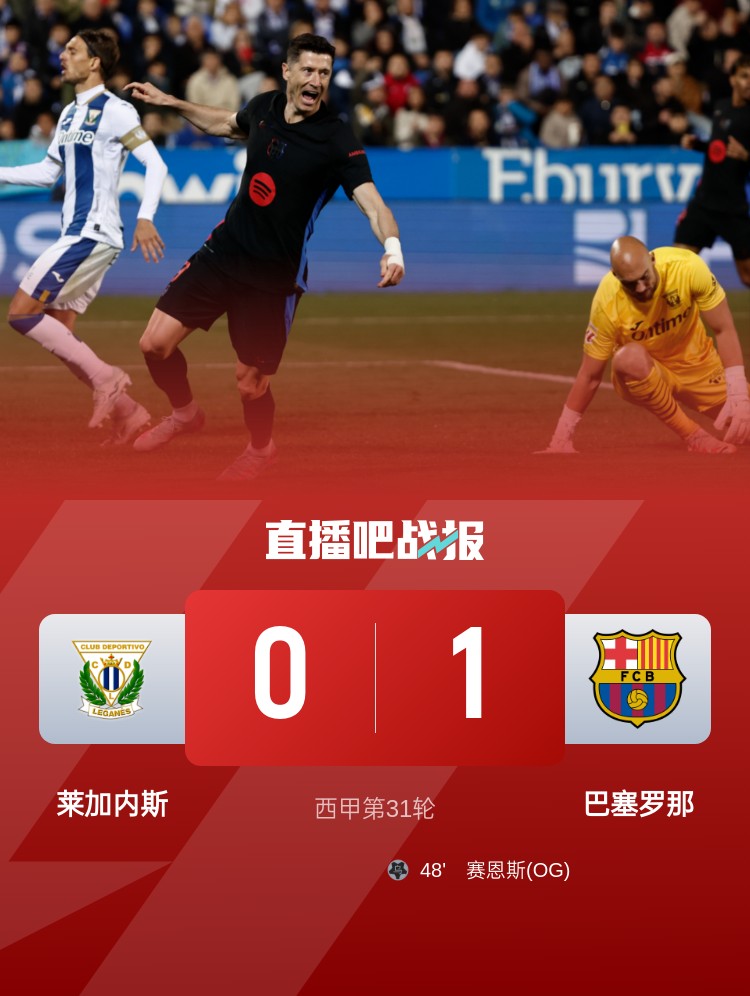 西甲第31轮,巴萨客场1-0战胜莱加内斯,拉菲尼亚造乌龙。