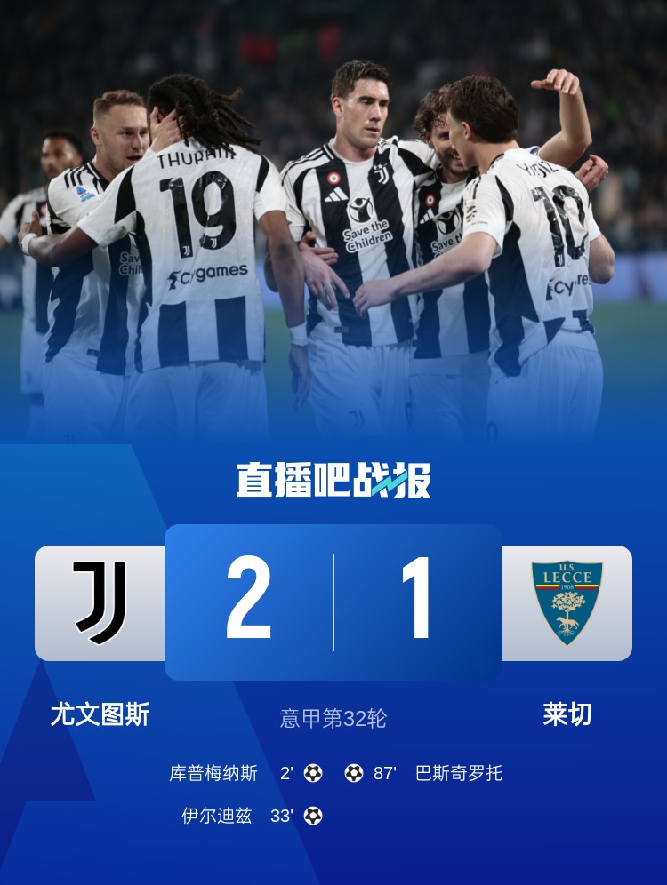 意甲第32轮,尤文图斯2-1莱切,库普梅纳斯、伊尔迪兹进球,弗拉霍维奇两次助攻。