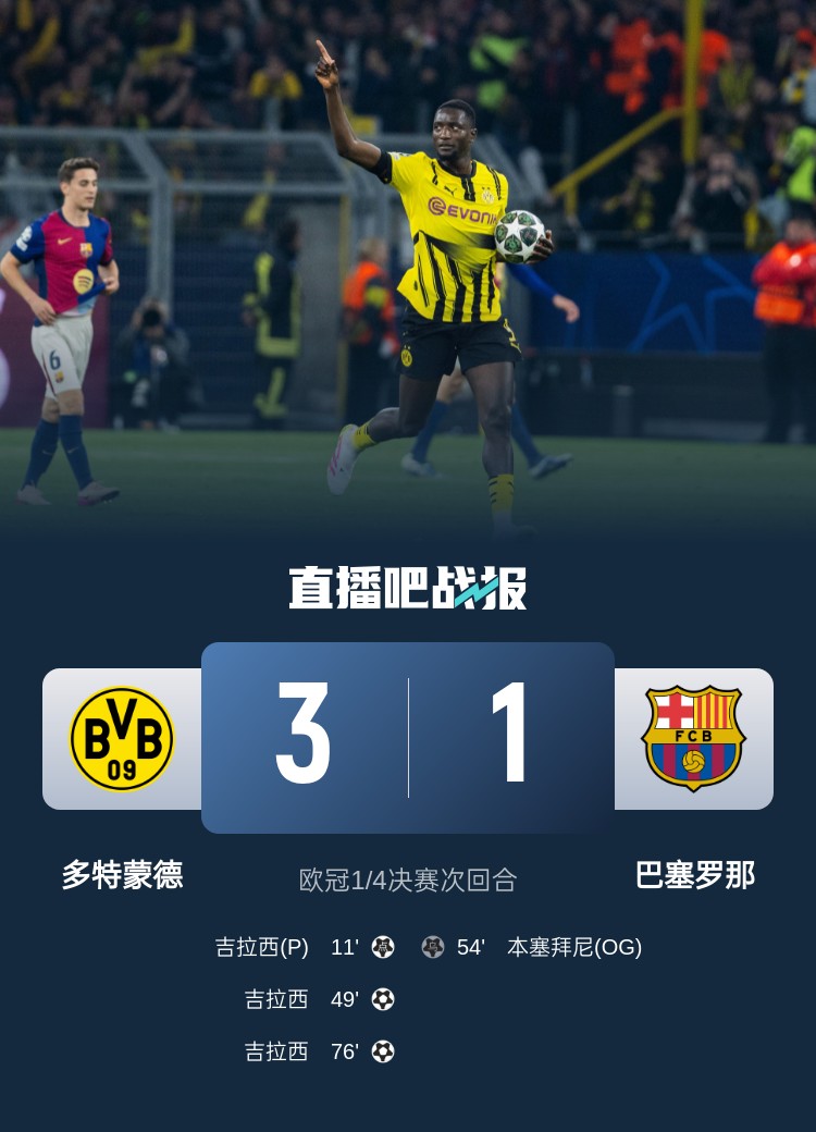 欧冠1/4决赛次回合,多特3-1总比分3-5巴萨。上半场,什琴斯尼送点,吉拉西点射首开纪录,格罗斯单刀破门被吹;下半场,吉拉西双响上演帽子戏法,费尔明造乌龙。