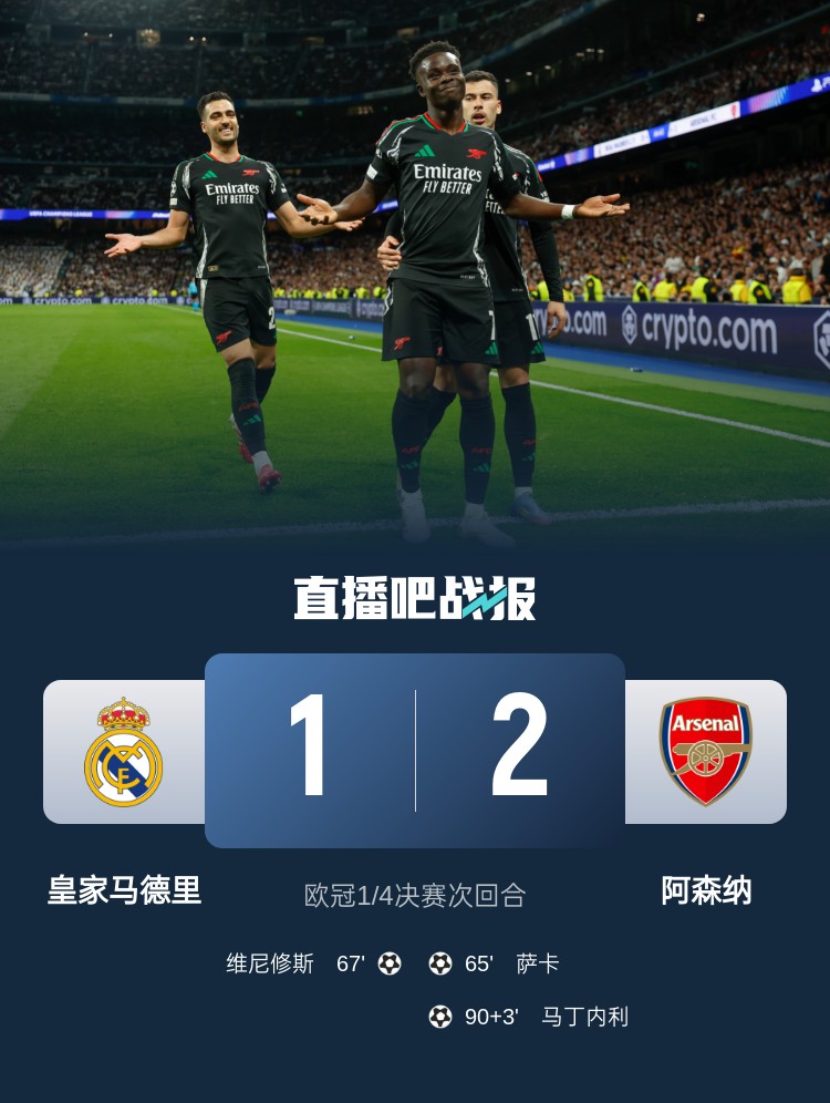 欧冠1/4决赛次回合,阿森纳客场2-1皇马,总比分5-1晋级四强,萨卡、马丁内利进球。