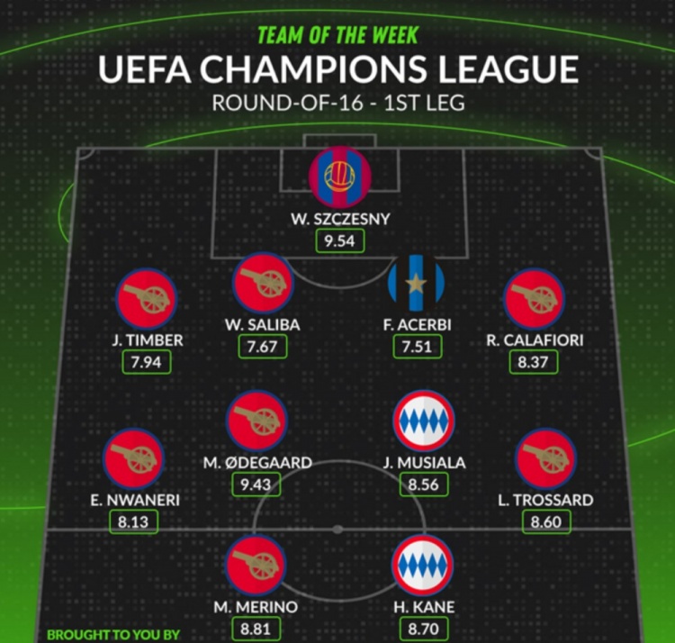 3月6日讯 数据网站Whoscored盘点了本轮欧冠评分最高阵容,其中取得7-1大胜的阿森纳有7人入选,门将位置什琴斯尼力压阿利森在列,具体阵容如下: