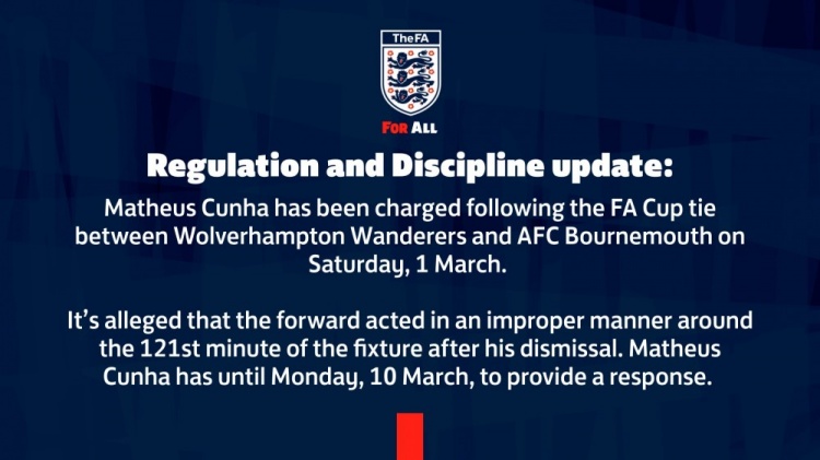 英足总官方表示:“在3月1日足总杯狼队对阵伯恩茅斯的比赛之后,对库尼亚提出指控,这位前锋在被罚下后行为不当,他必须在3月10日周一之前做出回应。”