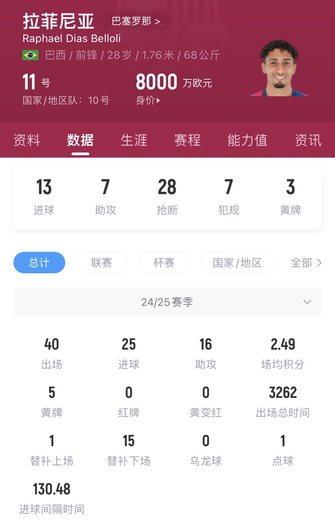 实打实的8000万!拉菲尼亚25球16助,金球奖赔率第3高于维尼修斯