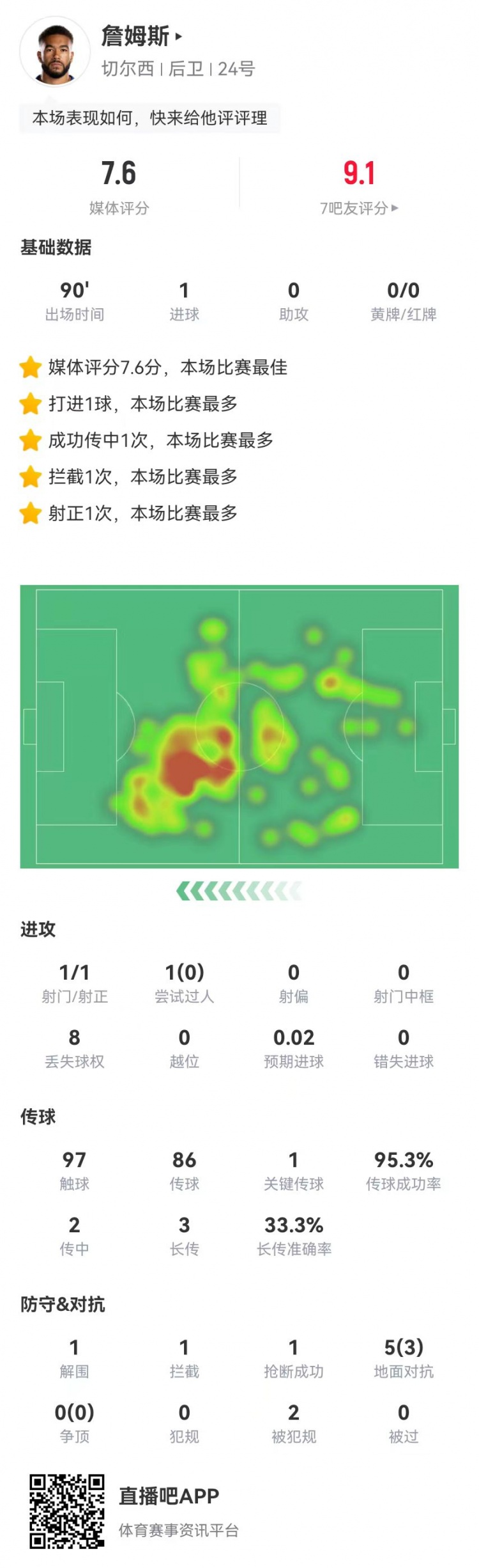 - 里斯-詹姆斯客串后腰数据:1球+1关键传球 5对抗3成功 7.6分最高