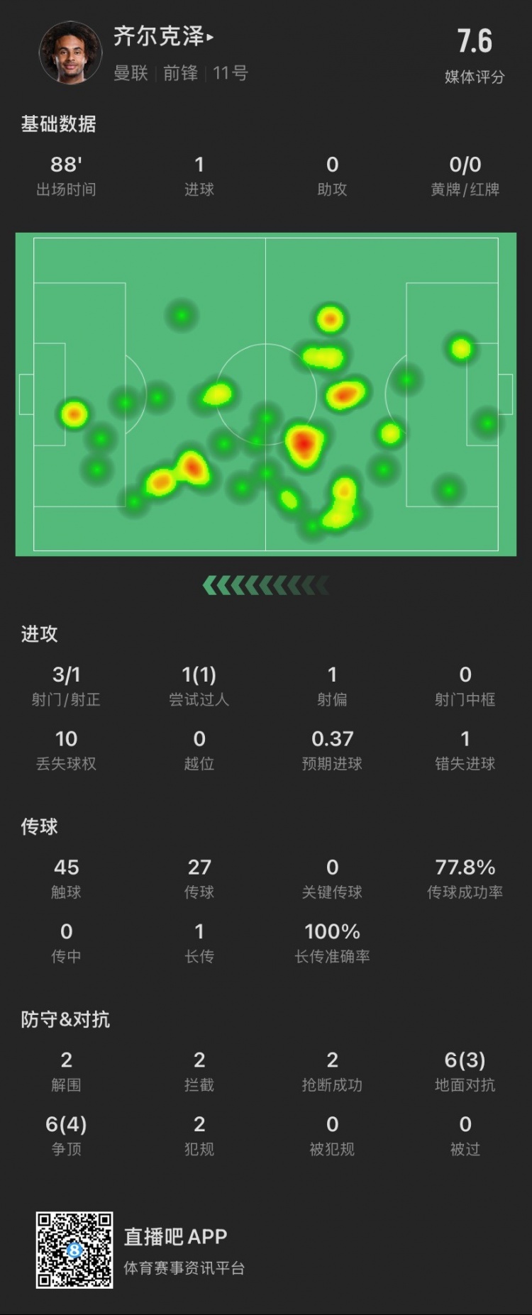 - 齐尔克泽本场:3射1正进1球,贡献2解围2抢断,12次对抗成功7次