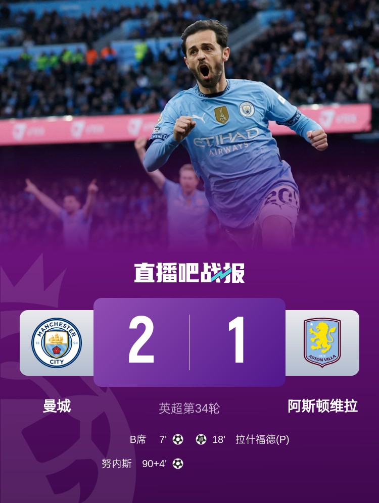 英超第34轮,曼城2-1战胜维拉,终结维拉英超5连胜。上半场,拉什福德开场中柱,随后B席破门,迪亚斯送点,拉什福德点射扳平;下半场,马尔穆什破门但越位无效,多库94分钟助攻努内斯绝杀。