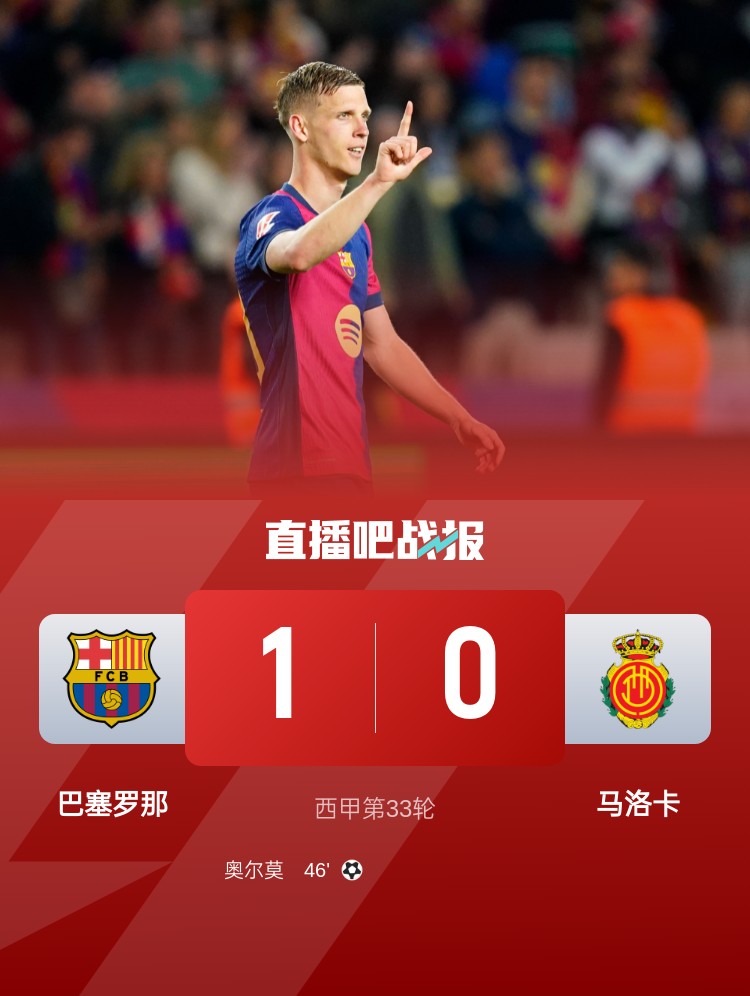 西甲第33轮,巴萨1-0马洛卡,联赛三连胜。上半场,奥尔莫中柱,巴萨轰24脚射门依然未能进球;下半场,埃里克-加西亚助攻奥尔莫破门,亚马尔失单刀。