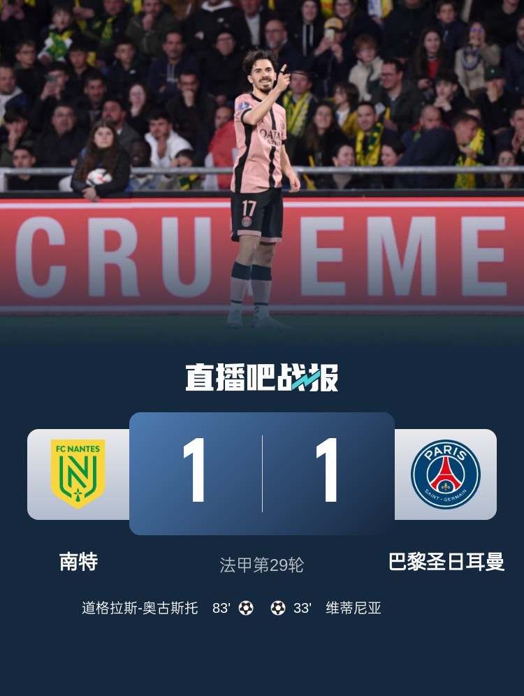 法甲第29轮,巴黎1-1战平南特。上半场,维蒂尼亚帮助巴黎取得领先;下半场,道格拉斯-奥古斯托帮助南特扳平。