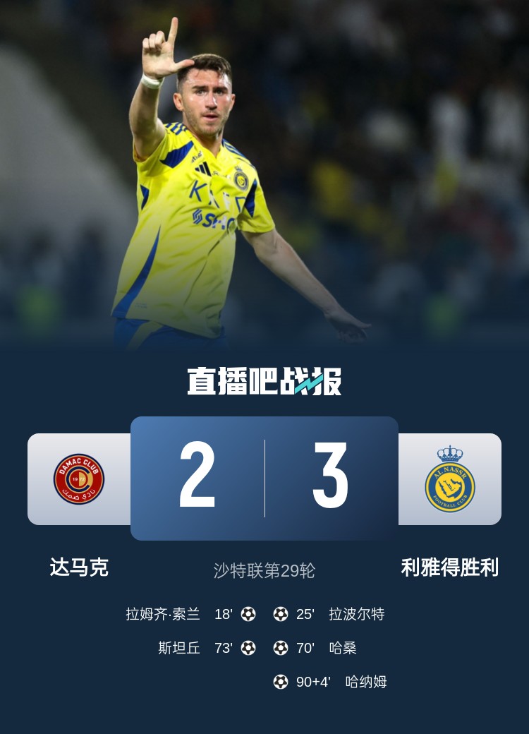 沙特联第29轮,利雅得胜利客场3-2逆转达马克。上半场,索兰先拔头筹,拉波尔特扳平比分;下半场,哈桑替补反超,斯坦丘3分钟追平,哈纳姆补时94分钟绝杀。