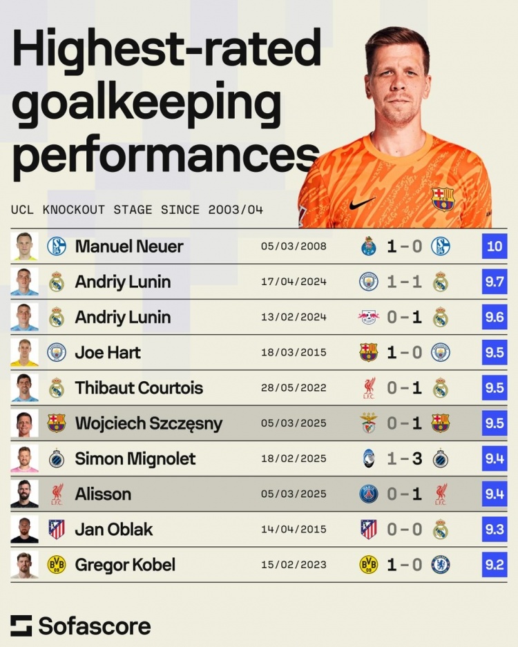 sofascore欧冠淘汰赛门将评分:08年诺伊尔唯一满分 3C阿利森在列