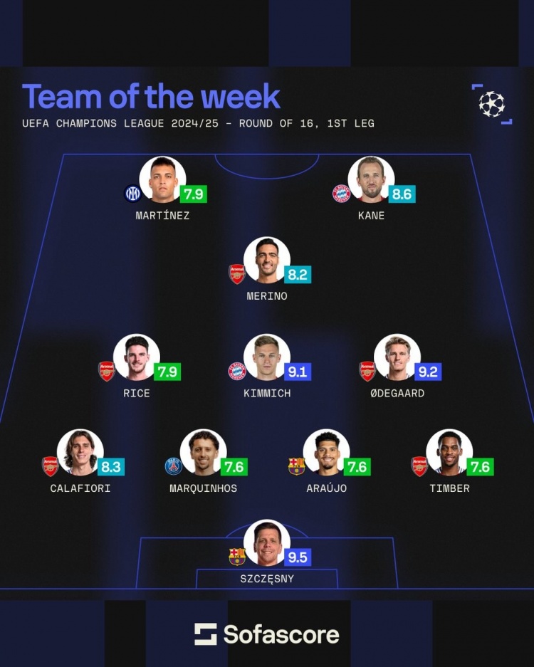 3月7日讯 欧冠16强战首回合已经完赛,sofascore也列出了他们的本轮评分最佳阵容,阿森纳5将在列。