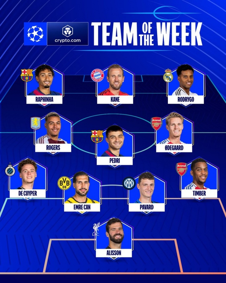 本轮欧冠官方最佳阵:阿利森&厄德高领衔,凯恩&罗德里戈在列