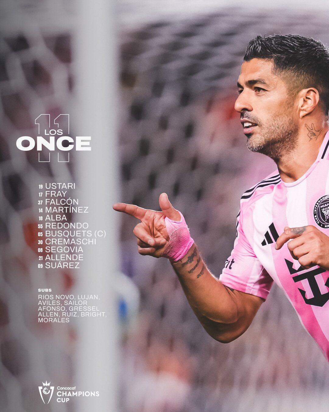 迈阿密国际首发:19-乌斯塔里、17-弗雷、37-法尔孔、14-马丁内斯、18-阿尔巴、55-雷东多、5-布斯克茨、30-克雷马斯基、8-塞戈维亚、21-阿连德、9-苏亚雷斯