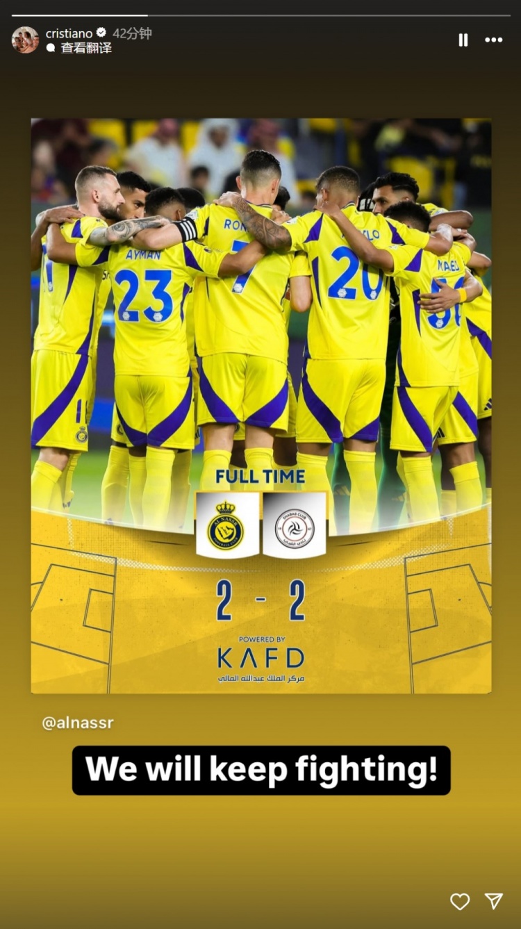 赛后,C罗在个人社交媒体少出全队拥抱的照片,写道:我们会继续战斗!