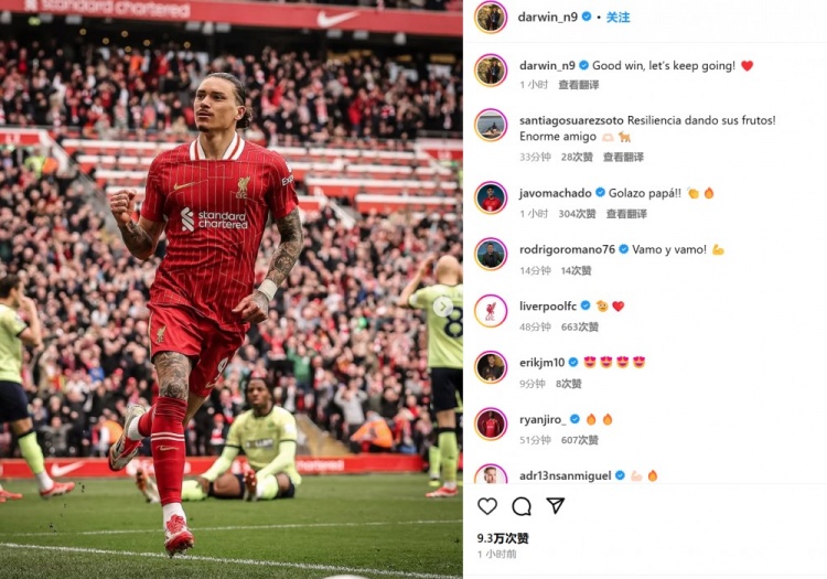 努涅斯也在赛后通过社媒晒出自己进球后的庆祝照,并配文:“很棒的胜利!让我们继续努力!”