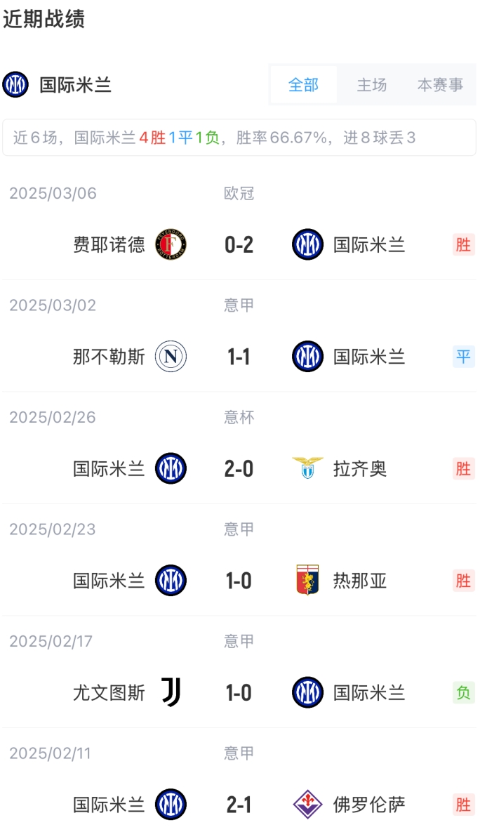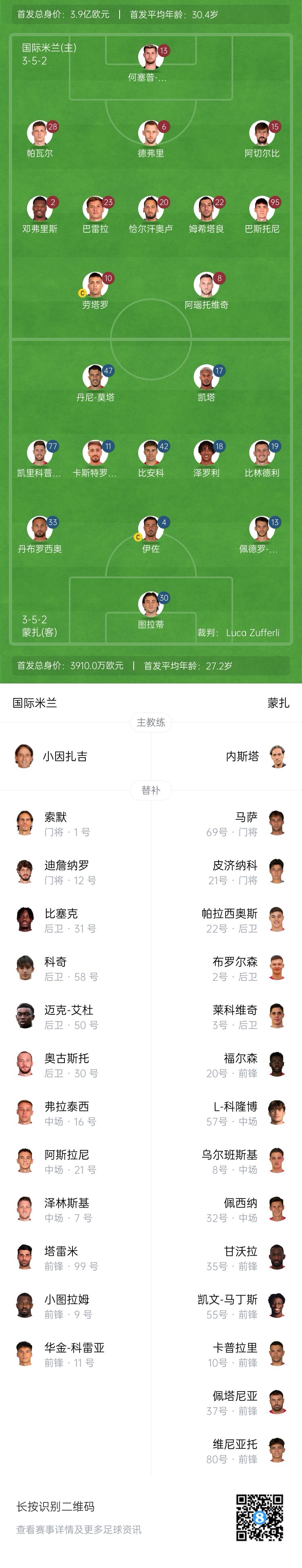 国米首发:13-J-马丁内斯、28-帕瓦尔、6-德弗里、15-阿切尔比、2-邓弗里斯、23-巴雷拉、20-恰尔汗奥卢、22-姆希塔良、95-巴斯托尼、10-劳塔罗、8-阿瑙托维奇