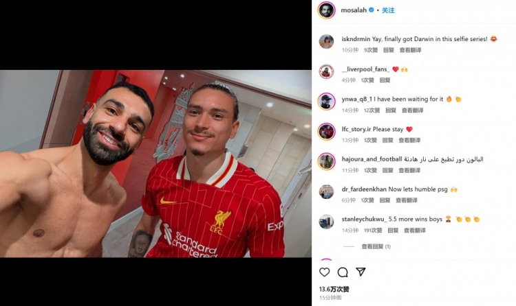 萨拉赫在本赛季比赛后通常都会晒出自己和进球队友的合照,球迷们也调侃道:“终于轮到努涅斯了。”