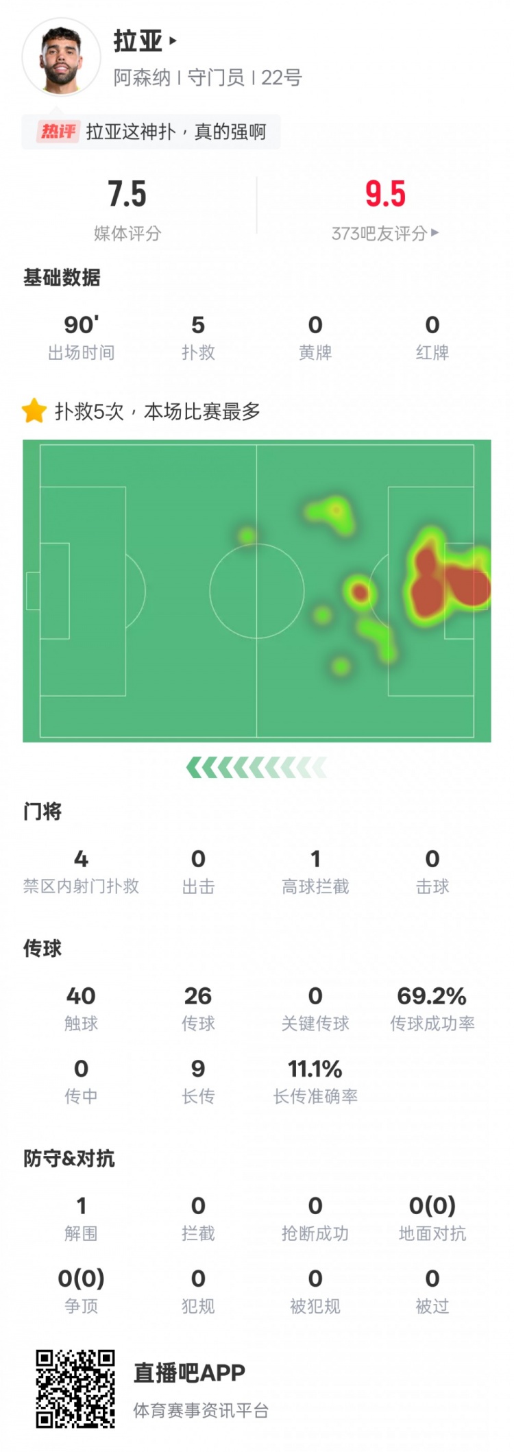 拉亚本场数据:5次扑救全场最多&4次扑救对手禁区内射门,评分7.5