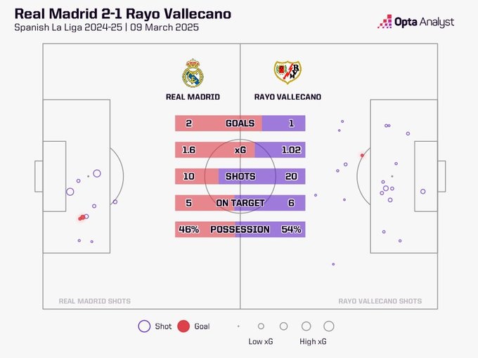 OPTA统计表明,本场比赛巴列卡诺有20次射门,而皇马只有10次,这是除了面对巴萨之外,皇马自2008年1月以来在西甲主场与对手最大的射门次数差。