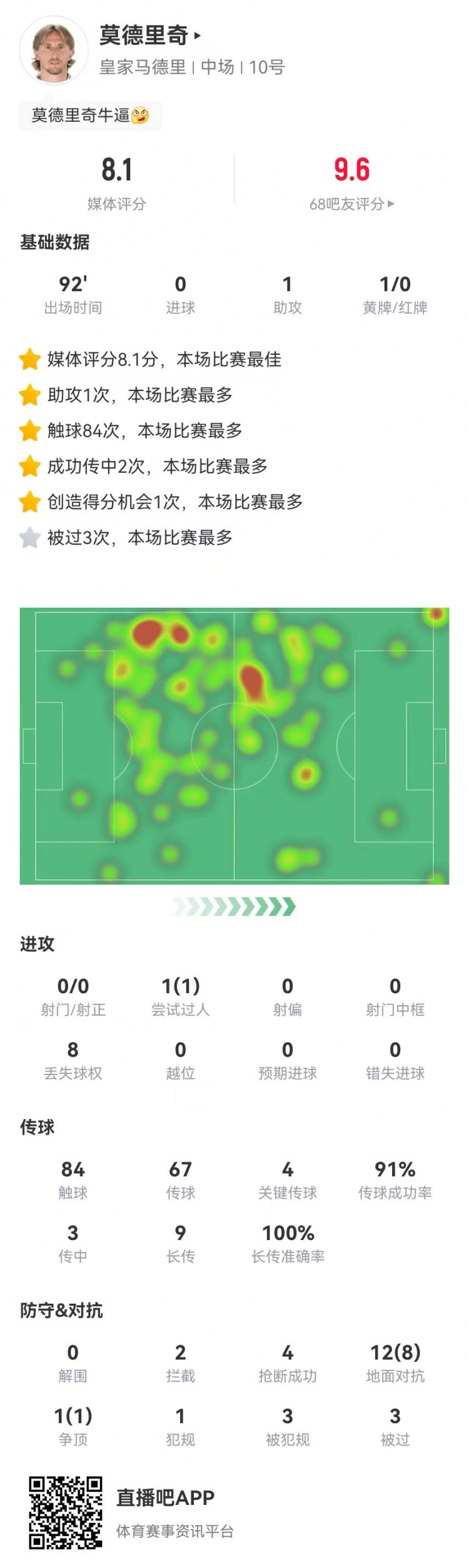 - 莫德里奇本场1助攻4关键传球 10长传9成功 13对抗9成功 8.1分最高