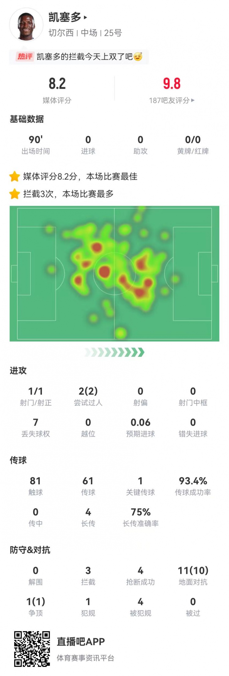 - 凯塞多本场12对抗11成功+4造犯规 3拦截4抢断0被过 获评8.2分最高